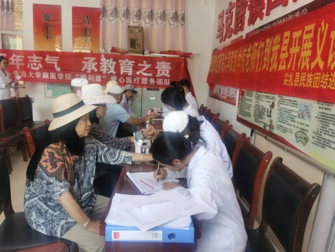 在此过程中我们对村民进行采血测量血糖、检测血压、采取藏医传统治疗方法“望”、“触”、“问”三种方法对村民的健康进行较为全面的检查,以及进行对症给药。